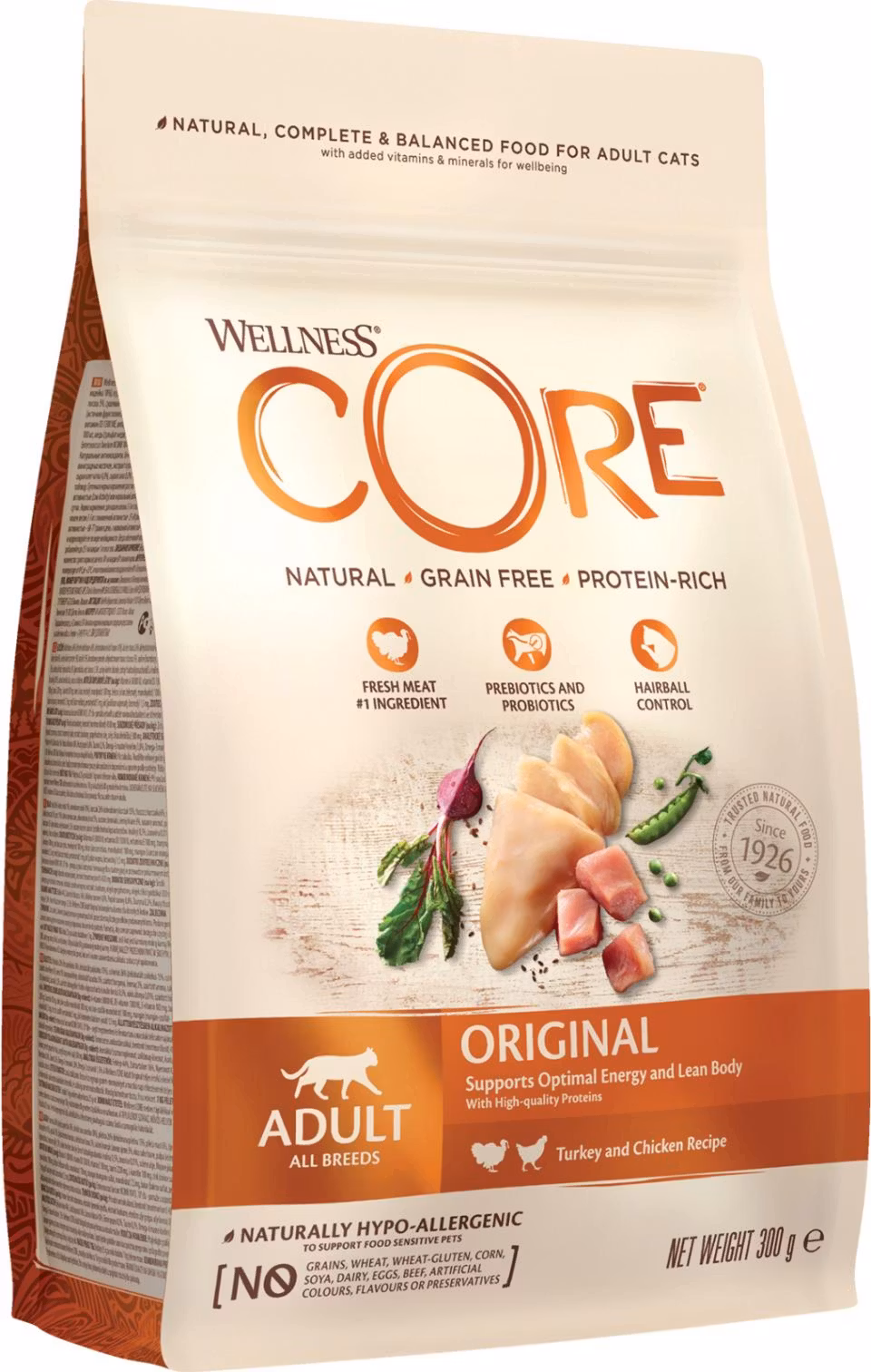 Wellness CORE Cat Adult Original med kalkon och kyckling är ett spannmålsfritt torrfoder för vuxna katter, utvecklat för att stödja optimal hälsa, vikt och livslängd. Med ett högt proteininnehåll på 44 % bidrar fodret till starka, magra muskler och stabil energinivå.