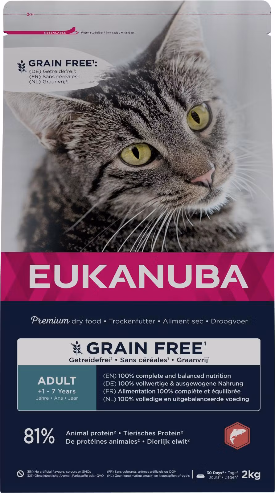 EUKANUBA spannmålsfri torrfoder för vuxna katter är ett 100 % komplett och balanserat helfoder, särskilt framtaget som ett alternativ för katter med särskilda näringsbehov. Receptet innehåller en hög andel animaliskt protein – hela 81 % av den totala proteinnivån – för att hjälpa till att bygga och bibehålla starka, magra muskler.